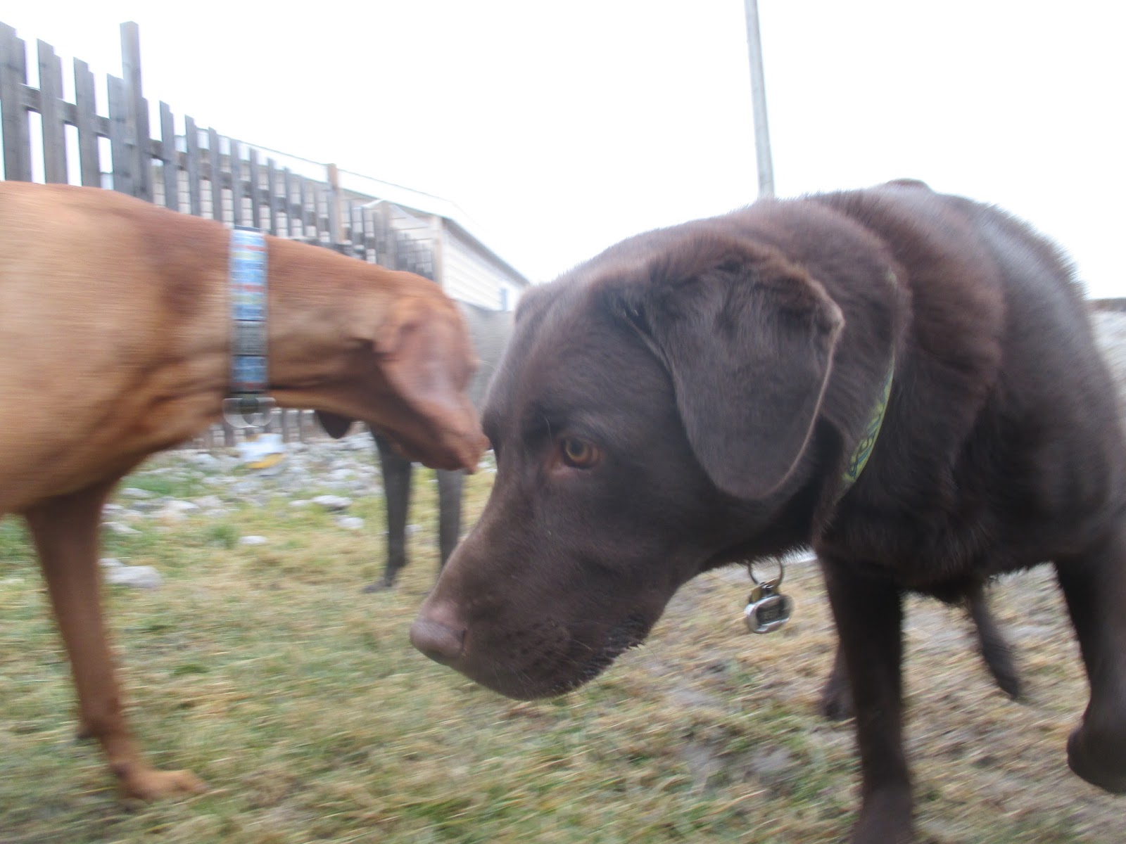 Fez made himself a girlfriend today in the yard! Hershey, the adorable chocolate lab, came in last night and met Fez for the first time this morning. They hit if off right away. Hershey has lots of energy and is constantly moving around in the yard, trotting from one dog to the next, making sure she knows what everyone is up to in the yard. Fez was so love struck with her that he followed her around almost the whole time. When he wasn't right behind her, he was nearby. Fez even wanted to get her to play with him. He got into a playful stance and barked at her, inviting her to play. Hershey was happy that Fez really liked her and she seemed to like him as well, but she wasn't in the mood to play. She more likes to spend her time wandering around, taking in all there is to see outside. Hershey also met Dexter today. Dexter is just like Hershey, where he likes to check out what everyone else is doing. These two stuck close by one another as well.