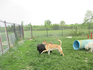 Charlotte was so excited to go outside today and play with all of her friends in her group. She is still a puppy which means she has so much energy and loves to run around the yard with whoever is ready to keep up with her. She had a special interest in Harvey; he's also a puppy so they both got along great and have the same level of energy. When they both got outside, Harvey started to chase her right away and they ran all the way to the further yard and started to wrestle in the grass. He really likes to wrestle around while Charlotte just wanted to play tag. Whenever she broke free they would begin to chase each other again until he caught back up to her. Charlotte loves to play rough though and can handle all of the rolling around unlike some of the older dogs in their group. As they were running around the agility yard she picked up a long rope toy and started to run up to me with it in her mouth just as Harvey ran over and grabbed the other end. The two of them started to play tug of war and tried their hardest to get it from one another but neither of them could do it. Eventually Charlotte got it to herself when she decided to roll around on the ground when he was still holding onto the rope. Harvey seemed to be wondering why she was rolling in the grass so he decided to let go. Later on, Charlotte ran over to see me and jumped up for lots of kisses while Harvey ran around to find another dog to play with who was outside. He came across Goliath who was running around with him and Charlotte earlier but never jumped and joined in with them.