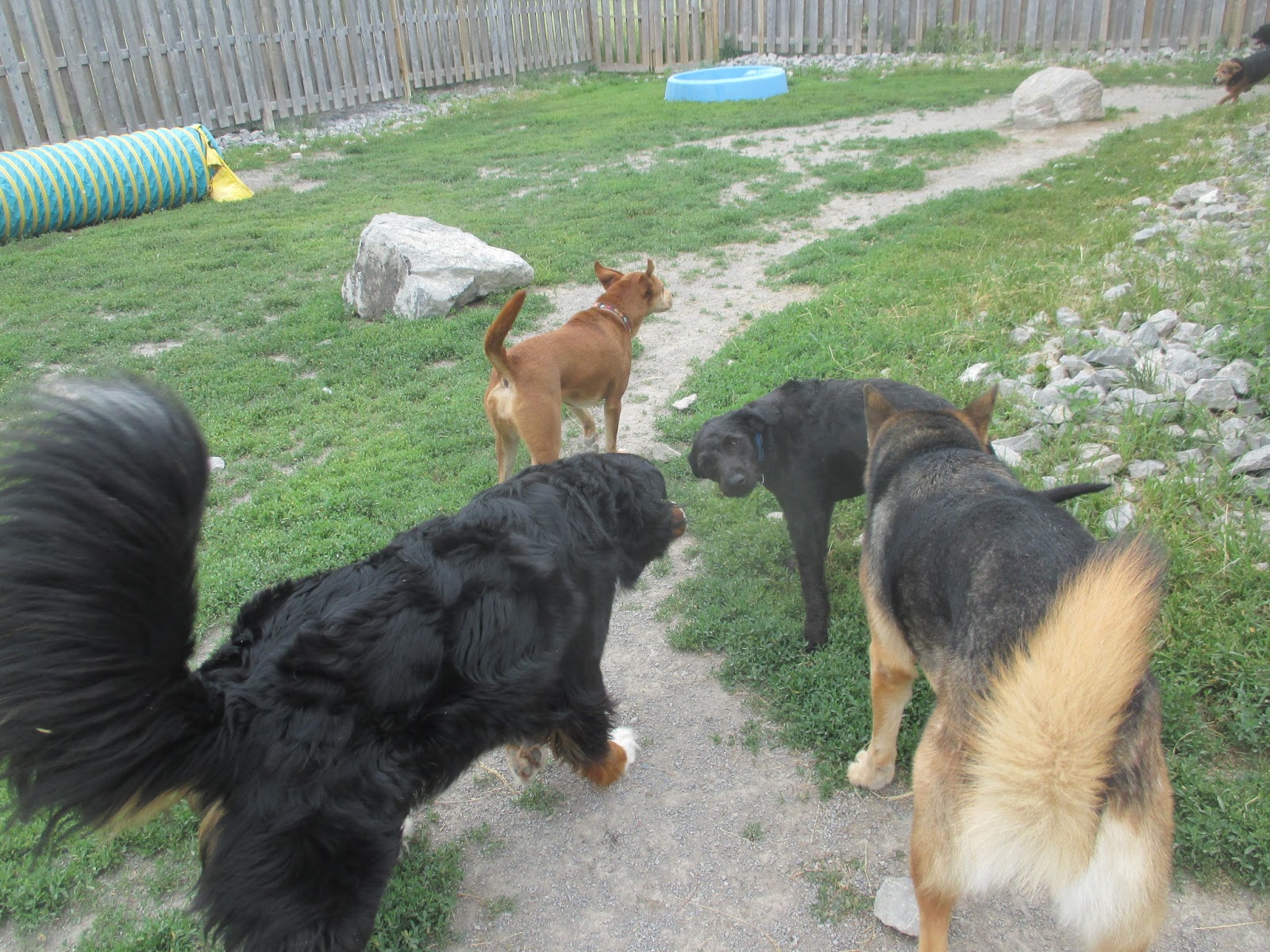 Harvey absolutely adores his time here. He has got to be one of the happiest little guys around. He knows exactly what his day will consist of when he arrives in the morning, and he can hardly wait to get the day underway. He sure keeps everyone busy during walk time since he loves to bounce through the long grass and dance around with his friends. Luckily his morning walk tires him out for a little bit, keeping him calm until his group time. The moment he got in the yard today he spotted Finnigan across the yard and bounced his way over to him. He immedately began pawing at him and playbowing. These two were so cute romping around in the grass, mouthing one another and slowly wrestling. It wasn't long before Glory the bloodhoud spotted Harvey and slowly made her way over to him. Harvey was instantly intrigued by the magnifecent Glory and drew all his attention to her. He was a bit flirty with her, but also pretty goofy trying to get her to play. She finally gave in to him and these two began boxing and wrestling, sending their puppy-like body parts flying all over one another. Their lack of co-ordination when it comes to playing was actually pretty cute. Harvey was definetely tired when it was time to come in and he conked out in his kennel until his next group outing.