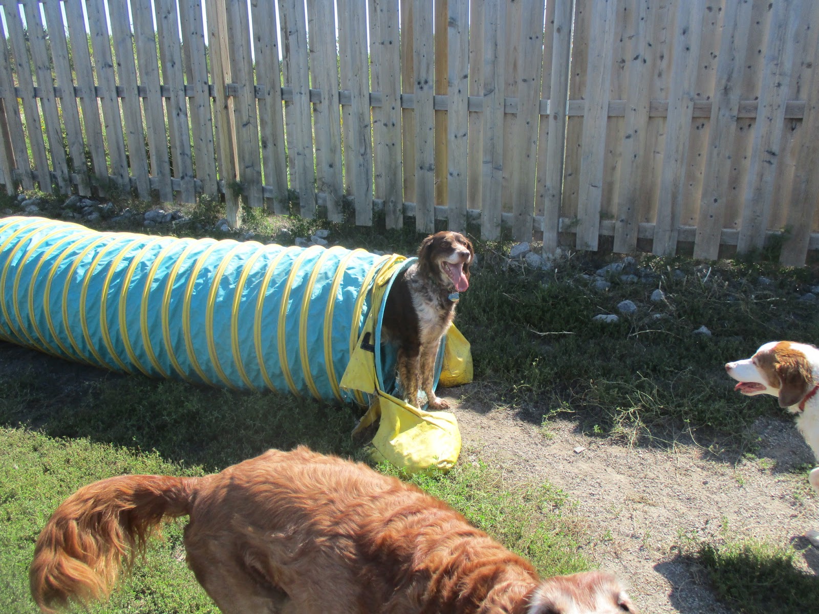 Egan is such a social butterfly. In the yard today he was so thrilled to have a couple new additions to his group. He was zooming around from dog to dog saying his hellos. After he said hi to all his friends, he started over again and checked every one out again. On his second pass around he met up with Titan who really sparked his interest. Egan began pawing at his side, looking for a playmate. Titan wasn’t interested at first, however after a bit of begging on Egans part, Titan gave in. These two then began to zoom around the yard with Titan in the lead an Egan on his tail. Titan darted through the tunnel and then looped back around the agility yard. Every once in a while he would peak over his shoulder checking if Egan was still after him. Egan wasn’t going to let Titan win the race and bolted ahead of him just as they were coming towards me. I found myself leaping out of the way to ensure I didn’t get run over by Egan who was looking over his shoulder rather than where he was going. Egan and Titan put their chase on pause to cool off in the pool. Egan wasn’t too sure about getting in the water at first but once he saw Titan splashing around he briefly dipped his paws in. Later on Egan was happy to hang out by my side and receive some pats and cuddles before it was time to head indoors.