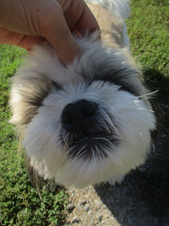 George went out for a shorter, less organized walk with Merlin this morning. The two older boys meandered and darted here and there, going wherever their noses took them. I practiced some hand signals with both of them, since they don't hear very well and they both caught on very quickly - they loved the treats they got when they came at a hand signal. George and Titan had the lounge to themselves for their extra attention time. It was nice and cool in there and they love to explore. George pounced on a stuffless stuffy as soon as we got in the door, shaking and squeaking it happily. Titan checked out all the doors and windows as well as the couches and seemed quite fascinated by the treadmill. When I invited the boys up onto the couch, George quite happily joined me, and we sat together watching Titan continue to explore. After a while, they switched places and Titan joined me on the couch while George explored Titan soaked up the pets and massages I gave him and then George jumped up to join us. We finished off our time together with another small walk, staying in the shade as the boys explored around the buildings.