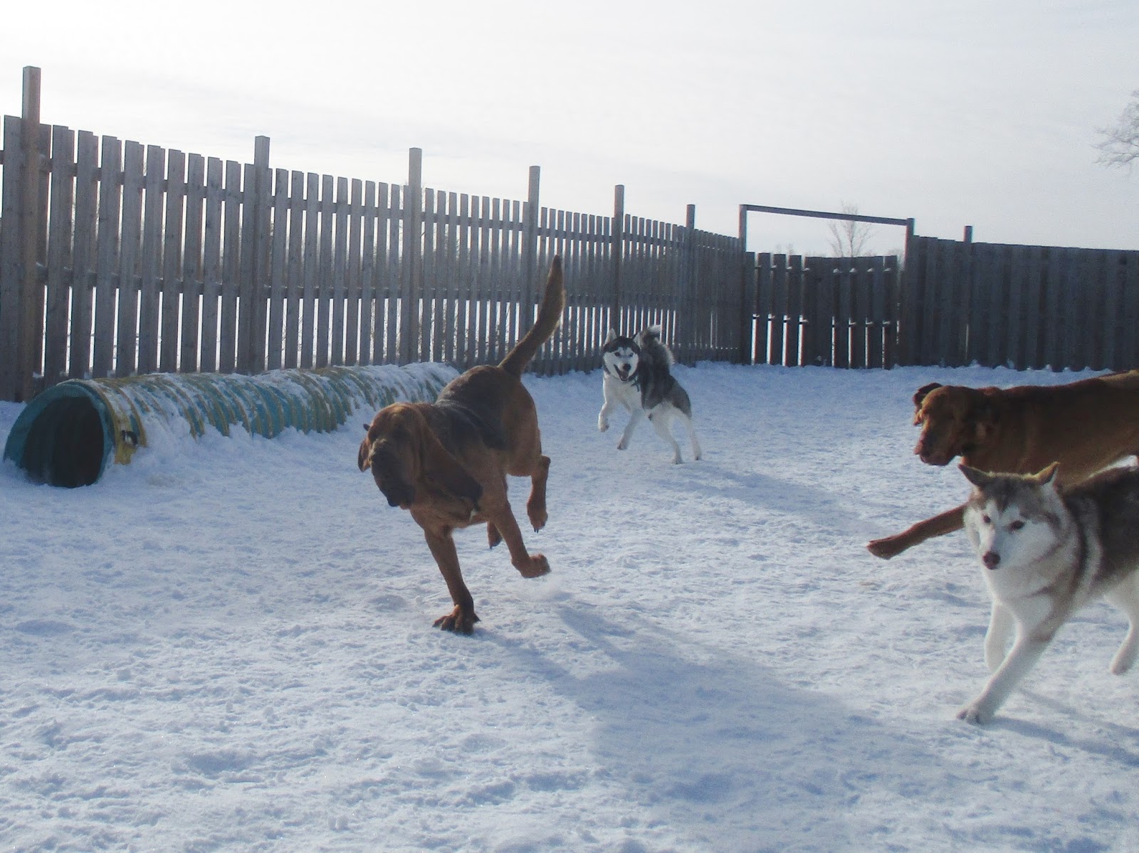 Max and Sadie were as usual super excited to head outside for group time. As soon as they got out the door they both went racing for the far yard. As Sadie was passing through the gate her nose hit the ground and she was off in search of interesting things. Max decided to follow her lead and do a little exploring of his own. He didn’t stay exploring long. Soon Max was racing back and forth between Sadie and I. He’d pause occasionally for a quick pet from before racing back to Sadie, who he then tried to convince to go running with him. Sadie was determined to keep exploring and managed to ignore and fend him off. She continued around the yard with her nose to the ground. Eventually Sadie ended up by the tunnel. Max took this as a sign and went and stared at her from the other side. It wasn’t long before Max got his wish and Sadie play bowed. Then they were off tearing around the yard at top speeds with some wrestling moves thrown in for fun. It wasn’t long before Sadie was distracted by something in the snow, so Max reverted back to running between her and I. The two of them then decided to make their way out to the main yard and do a little exploring in the deeper snow. Once they finished with that it was back to tearing around the yards. After some energy was burned off Sadie went and hopped up on the picnic table. She was more than happy to stay up there and get lots of pets from me. Max tried to get her to play some more, but she was really enjoying being Queen. He then decided to go and do some more exploring. Sadie watched him go, then went and joined him.