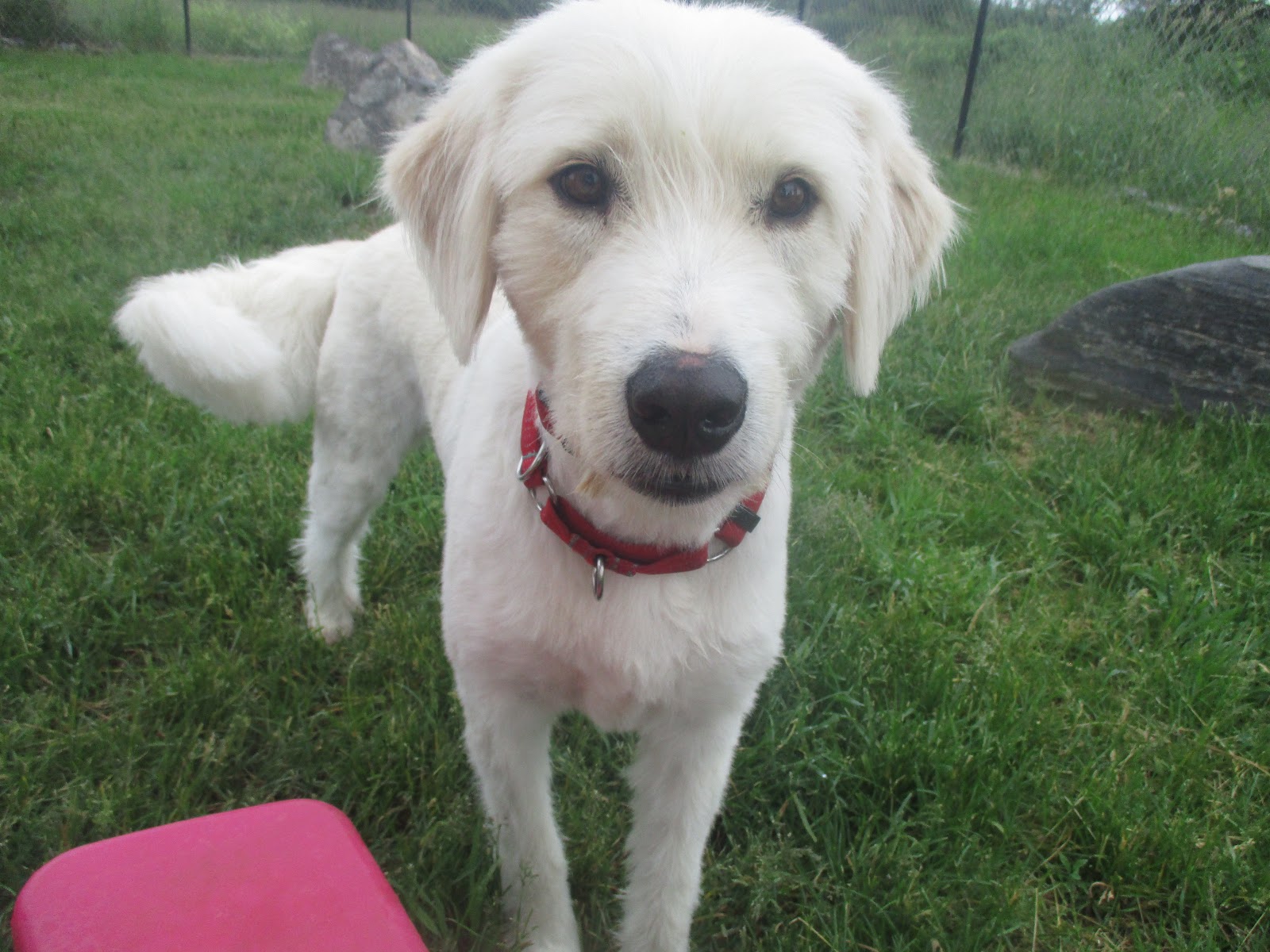 Vasco had a blast during play time today. Even though it was a bit rainy out he had a good time making lots friends. He got along wonderfully with German shepherds Viggo and Riley, all of them following each other around the yard. They investigated all the different rainy day smells and were constantly saying hello to each other. Vasco is such a happy and sweet dog and was really a part of the pack, playing and getting along so well with everyone. He was really curious as to what was happening out in the field as well and kept a watchful eye. He really is a popular guy, and was always excited to be in the middle of all the action. Vasco was quite an excited boy when it was time to join me for his extra attention time. He popped right out of his kennel and was ready to go exploring in the field. As soon as we got outside, Vasco led the way through the field while I tried to follow behind. His nose was leading him all sorts of places from in the daisies, to down by the creek and even in the long grass. Throughout the entire time that we were outside he had me moving. However towards the end, we took a few seconds to cuddle in the field. When Vasco and I came inside it was treat time! I got him to sit as well as lay down a few times and he'd do anything for the treat.